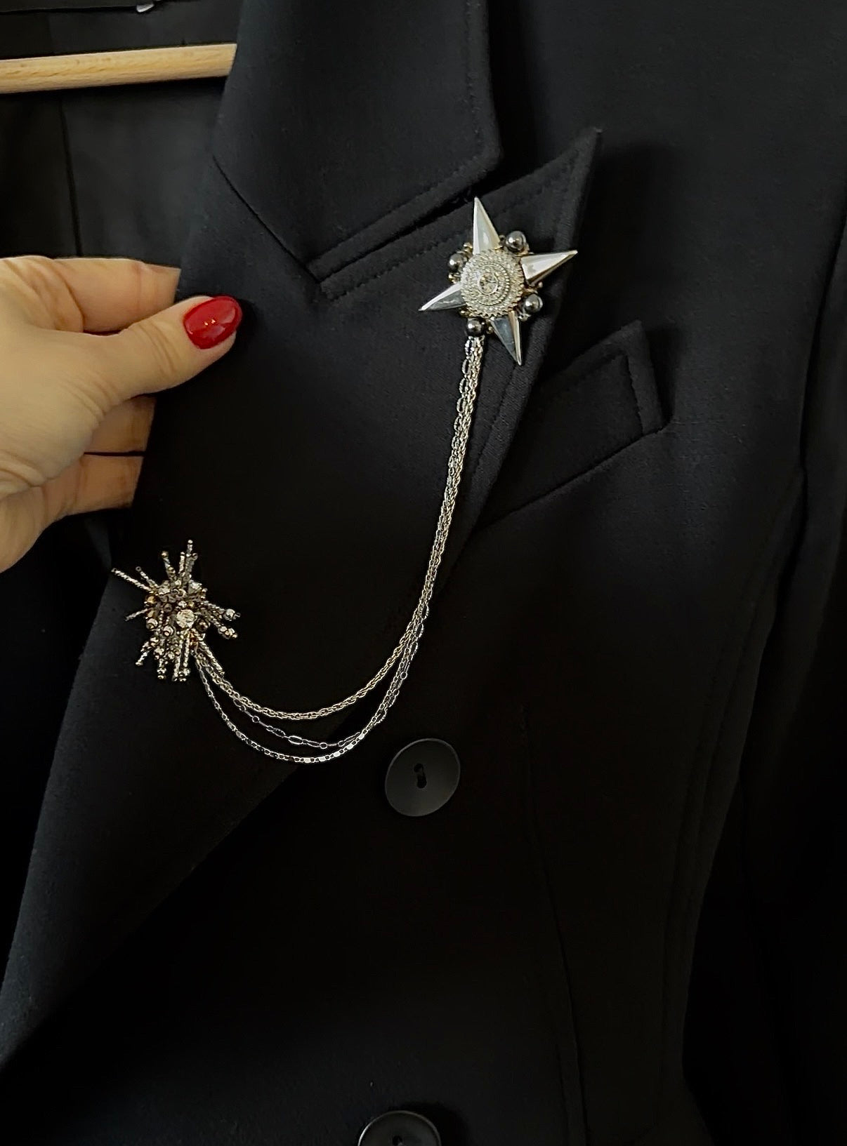 Grandinėlę gali derinti prie bet kurių 2 sagių, o jei norisi mano asmeninės rekomendacijos – šios sagės ypač gražiai su ja atsiskleidžia: ,,Minimali pilka sagė” , ,,Sagė su spygliais''.