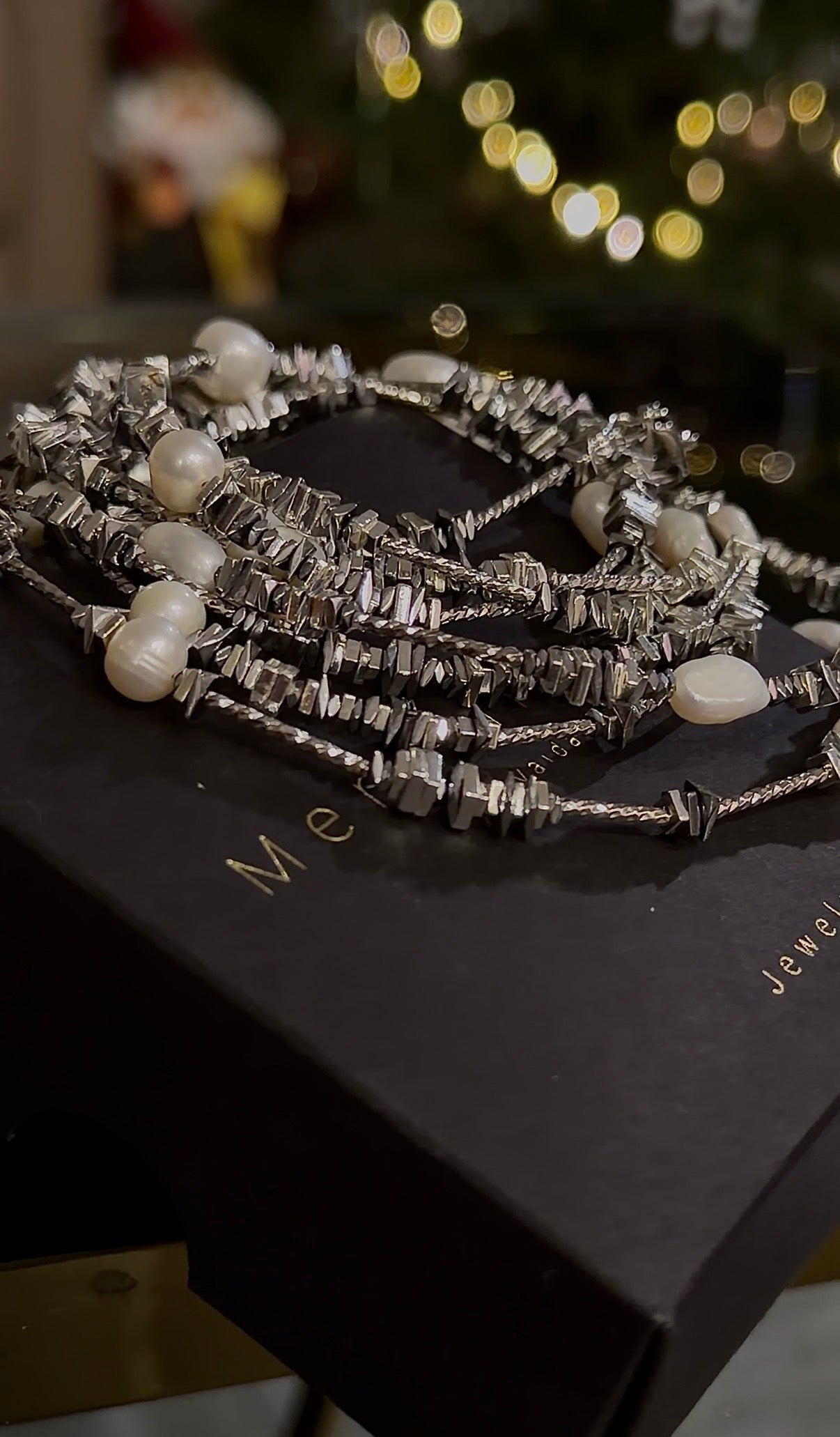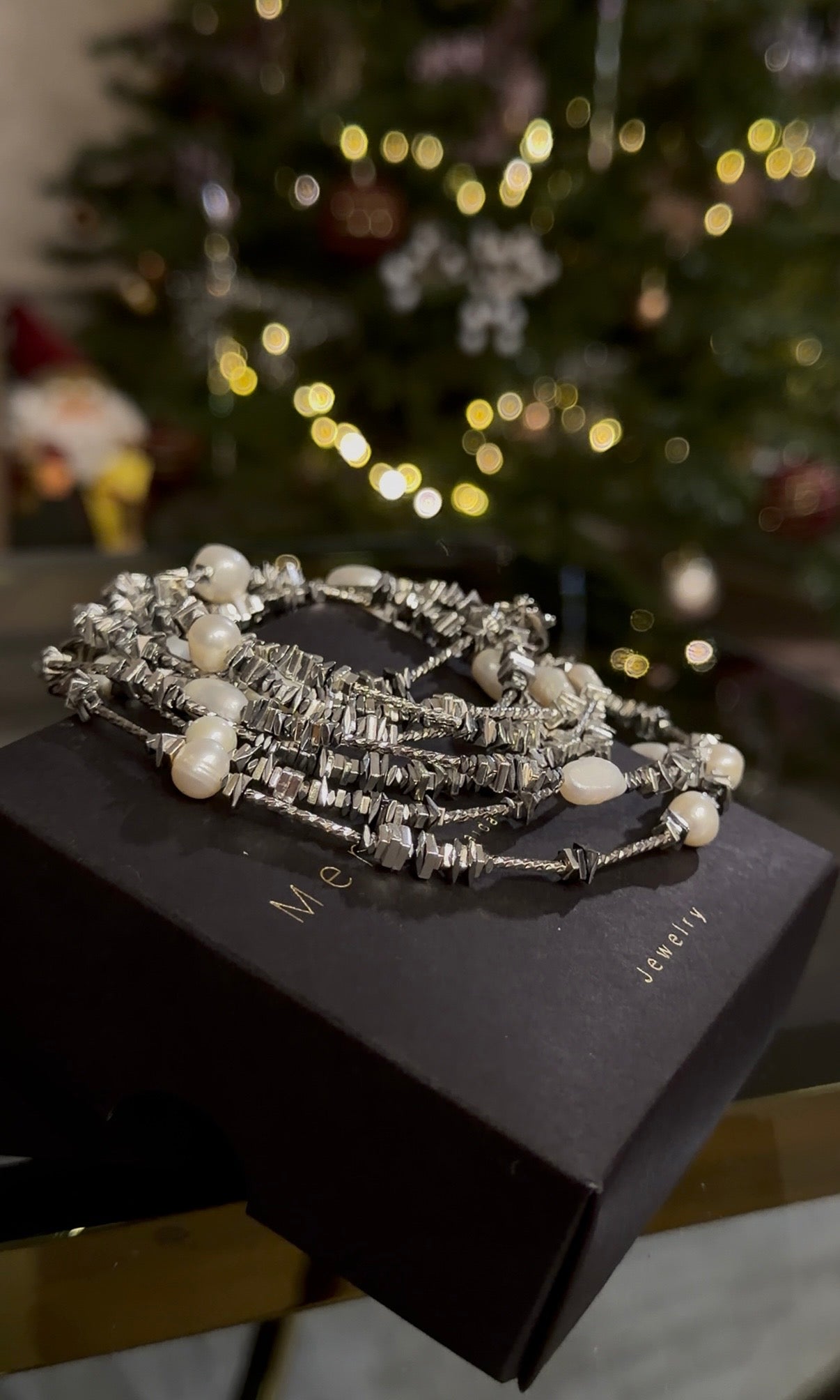 Šis ilgas vėrinys – apie moterį, kuri renkasi subtilų pasitikėjimą savimi. Smulkūs upiniai perlai ir sidabrinio atspalvio hematitas kuria švelnią, bet aiškią eleganciją – be triukšmo, bet su charakteriu.